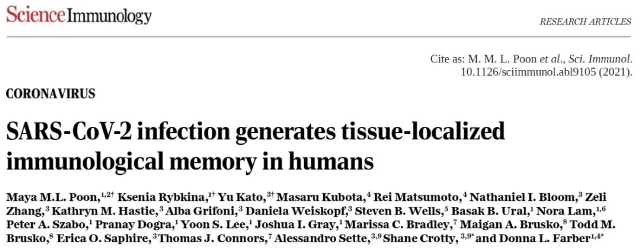 [1] Maya M.L. Poon et al., (2021) SARS-CoV-2 infection generates tissue-localized immunological memory in humans. Science Doi: 10.1126/sciimmunol.abl9105