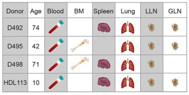 4名曾在2020年感染新冠后康复的患者为研究人员提供了宝贵样本。这些患者因为与新冠无关的其他原因而去世,并在去世后捐献了器官。研究人员对器官组织中的免疫细胞迅速进行了分离和功能分析,并与未感染过新冠的器官捐献者进行对比。