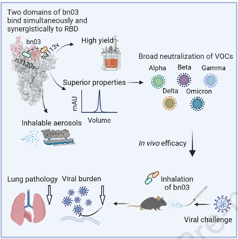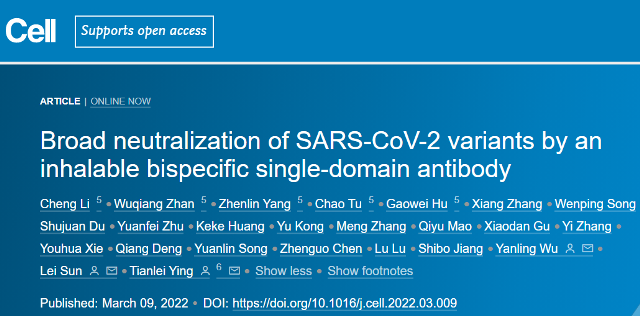 2022年3月9日,复旦大学应天雷,孙蕾及吴艳玲共同通讯在Cell 在线发表题为“Broad neutralization of SARS-CoV-2 variants by an inhalable bispecific single-domain antibody”的研究论文,该研究报告了广泛中和抗体识别的 Omicron 变体 RBD 上两个高度保守区域的鉴定。此外,该研究生成了一种双特异性单域抗体,该抗体能够同时协同地结合单个 Omicron 变体 RBD 上的这两个区域,如冷冻电镜结构所揭示的那样。