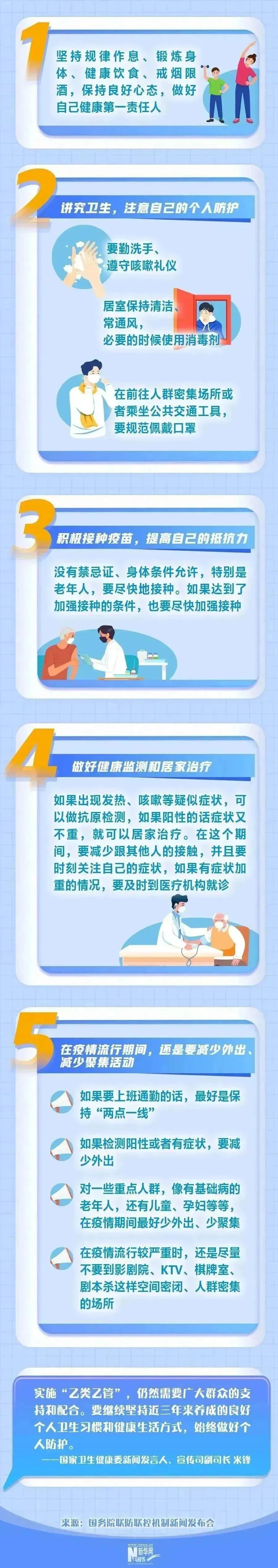 新型冠状病毒感染实施“乙类乙管”后,倡导个人继续保持良好卫生习惯,加强个人防护,按照要求分级分类就诊。《总体方案》指出,每个人都是自己健康的第一责任人,大家要继续坚持戴口罩、勤洗手等良好卫生习惯,在公共场所保持人际距离,及时完成疫苗和加强免疫接种。疫情严重时,患有基础疾病的老年人、孕妇、儿童等尽量减少前往人员密集场所。无症状感染者和轻型病例落实居家自我照护,减少与同住人接触,按照相关指南合理使用对症治疗药物,做好健康监测,如病情加重及时前往医疗机构就诊。