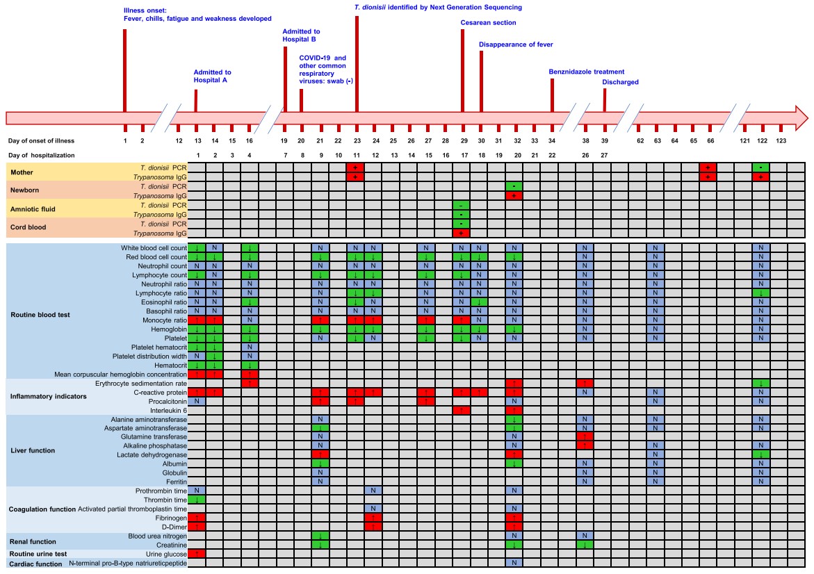 2024年9月26日,Journal of Infection发表了由中国疾控中心寄生虫病所、山东大学齐鲁医院和军事科学院共同完成的我国首例狄氏锥虫病的病例报告。该文章报道了我国首例狄氏锥虫病病例,患者是一名来自山东省的30岁孕妇,主要临床症状包括:持续发高烧,呼吸急促、胸闷,并伴有肝脏变化功能和炎症反应。对患者的实验室检测结果数据进行分析,结果表明其血液中检测到狄氏锥虫(Trypanosome dionisii)基因片段序列,18S rRNA和gGAPDH基因序列与日本蝙蝠和山东省蒙阴县蝙蝠体内发现了狄氏锥虫高度同源;同时,患者血清及新生儿的脐带血检测显示抗锥虫IgG抗体呈阳性。回顾性调查结果表明,从山东省捕获的野生小型哺乳动物中检测到狄氏锥虫感染。